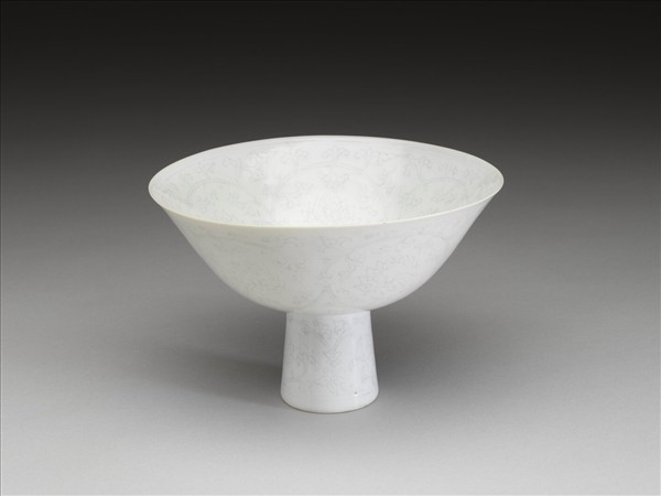 撇口,弧壁,高圈足,足部上窄下寬且中空,近底處微外侈。通體施白釉,白釉泛青,內、外壁飾纏枝番蓮六朵,足壁亦飾纏枝番蓮紋,高足上部與碗底接合處飾蓮瓣紋一周,內、外口沿及足之上下部各加飾細線二道,紋飾以刻劃線條仿透雕效果。胎壁勻薄,足底露胎。碗心有「大清乾隆年製」雙行六字楷款,外加雙圈。