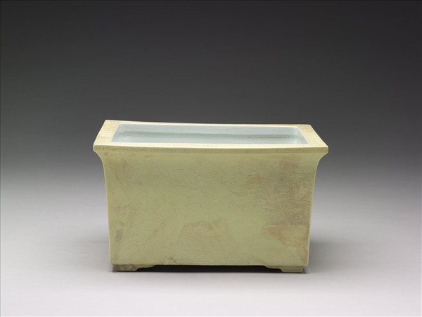 長方花盆、深直腹、梯形方足,底設兩圓形滲水孔。四面暗花刻劃芍藥、虞美人等花卉,內施白釉,外罩淡黃色低溫黃釉,風格清新。胎體厚重,燒造時為防塌底,設有細圓支釘兩圈共十六枚作為支撐,底心書「體和殿製」篆書陰刻印款。本件花盆原樣稿收藏在北京故宮博物院,由樣稿上的黃籤得知,當時共訂製三對不同尺寸的同類花盆。