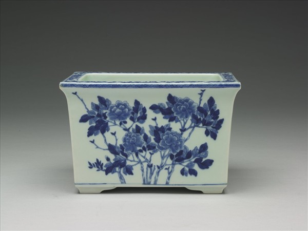 長方形盆,平板唇口微外撇,直壁,平底,梯形足。底設兩圓型滲水孔,胎壁厚達一公分,全器施白釉,足底露灰白胎。器底支釘痕兩圈,共十五枚。花盆以鈷藍作畫,平板唇沿飾辮紋及各色折枝小碎花。器身一面描牡丹花葉;另一面則繪蘭草。底心青花書「體和殿製」篆款。