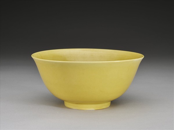 侈口窄唇,深壁,矮圈足。胎質較薄,內外滿施嬌黃釉,樸素無紋飾。底有青花書「大明正德年製」六楷字款,外加雙圈。