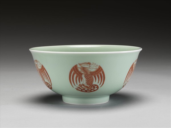 圓口,唇緣微外侈,弧形深壁,平底,矮圈足。器壁通施冬青釉,釉色呈粉綠。外壁裝飾五個描紅團鳳紋,碗心亦繪一團鳳紋,鳳首、軀體與鳳尾成S型,雙翅展開於兩側,使圖案成圓形,線條粗細分明。底有青花書「大清乾隆年製」三行六字篆款。