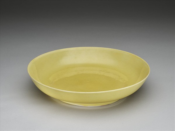 侈口,淺壁,矮圈足。胎質較薄,內外滿施嬌黃釉,盤底純白,樸素無紋飾。底有青花書「大明弘治年製」六楷字款,外加雙圈。