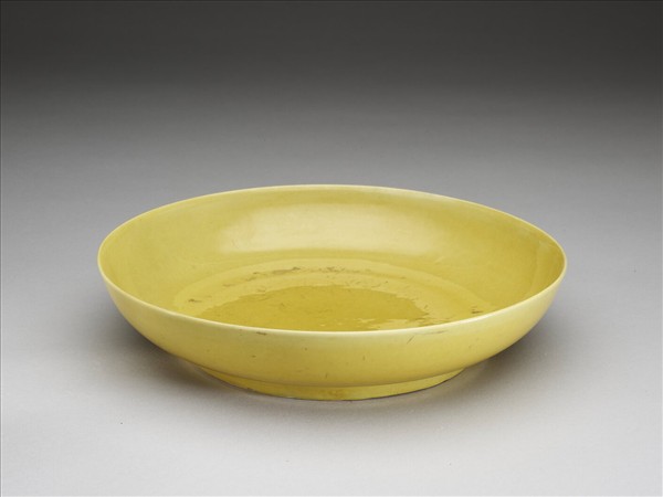 侈口,淺壁,矮圈足。胎質較薄,內外滿施嬌黃釉,盤底純白,樸素無紋飾。底有青花書「大明弘治年製」六楷字款,外加雙圈。