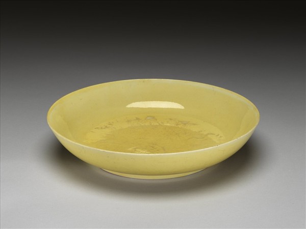 侈口,淺壁,矮圈足。胎質較薄,內外滿施嬌黃釉,盤底純白,樸素無紋飾。底有青花書「大明弘治年製」六楷字款,外加雙圈。