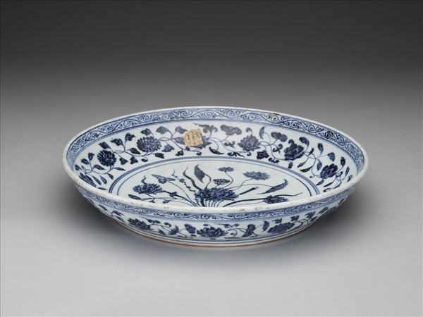 盤子弧壁,矮圈足。器底露胎,全器以青花為飾。口沿下飾卷草紋,內壁有蓮花、石榴、菊花等各式花朵共十三朵。外壁口沿下繪卷草紋,壁面畫纏枝花卉十四朵,近圈足處有回紋一周。盤心主紋飾是蓮花、慈菇等紮成的花束。因為外交往來以及貿易交換等因素,土耳其的托普卡普宮殿博物館以及伊朗的阿德卑爾神廟收藏有大量的十五世紀初期青花瓷器,類似這件作品的青花一把蓮盤,在兩大收藏中也都可以見到。