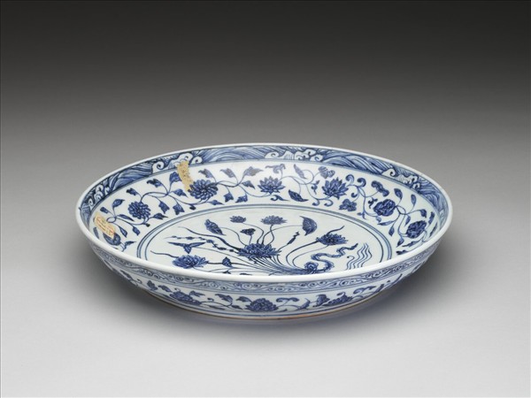 盤子弧壁,矮圈足。器底露胎,全器以青花為飾。口沿下飾波濤紋,內壁有蓮花、石榴、菊花等各式花朵共十三朵。外壁口沿下繪卷草紋,壁面畫纏枝花卉十四朵,近圈足處有回紋一周。盤心主紋飾是蓮花、慈菇等紮成的花束。因為外交往來以及貿易交換等因素,土耳其的托普卡普宮殿博物館以及伊朗的阿德卑爾神廟收藏有大量的十五世紀初期青花瓷器,類似這件作品的青花一把蓮盤,在兩大收藏中也都可以見到。