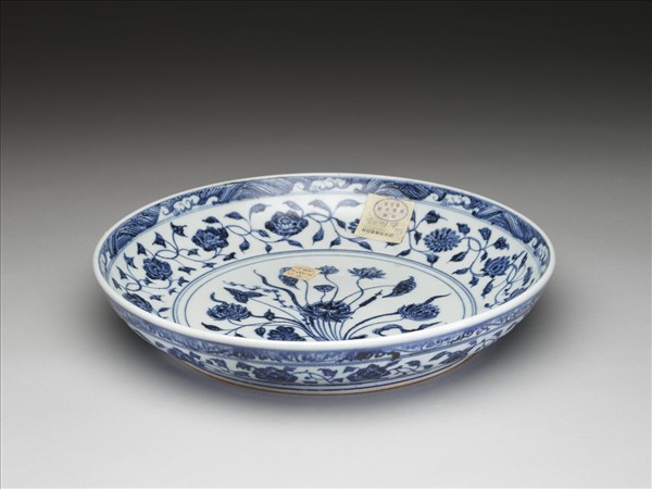 盤子弧壁,矮圈足。器底露胎,全器以青花為飾。口沿下飾波濤紋,內壁有蓮花、石榴、菊花等各式花朵共十三朵。外壁口沿下繪卷草紋,壁面畫纏枝花卉十四朵,近圈足處有回紋一周。盤心主紋飾是蓮花、慈菇等紮成的花束。因為外交往來以及貿易交換等因素,土耳其的托普卡普宮殿博物館以及伊朗的阿德卑爾神廟收藏有大量的十五世紀初期青花瓷器,類似這件作品的青花一把蓮盤,在兩大收藏中也都可以見到。