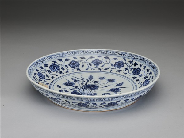 盤子弧壁,矮圈足。器底露胎,全器以青花為飾。口沿下飾卷草紋,內壁有蓮花、石榴、菊花等各式花朵共十三朵。外壁口沿下繪回紋,壁面畫纏枝花卉十四朵,近圈足處有卷草紋一周。盤心主紋飾是蓮花、慈菇等紮成的花束。因為外交往來以及貿易交換等因素,土耳其的托普卡普宮殿博物館以及伊朗的阿德卑爾神廟收藏有大量的十五世紀初期青花瓷器,類似這件作品的青花一把蓮盤,在兩大收藏中也都可以見到。