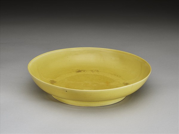 侈口,淺壁,矮圈足。胎質較薄,內外滿施嬌黃釉,盤底純白,樸素無紋飾。底有青花書「大明弘治年製」六楷字款,外加雙圈。