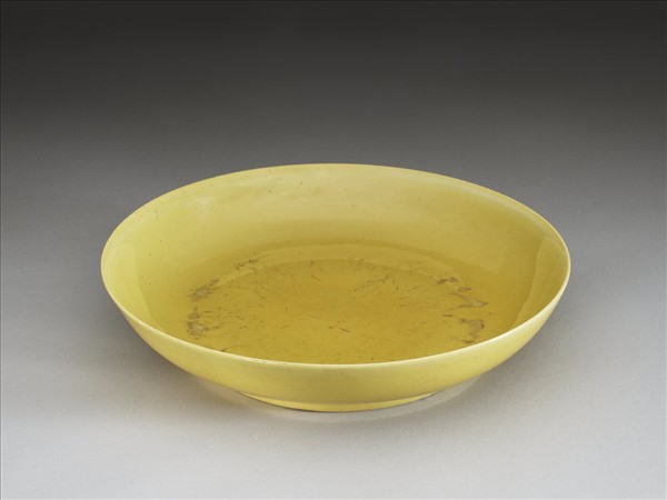 侈口,淺壁,矮圈足。胎質較薄,內外滿施嬌黃釉,盤底純白,樸素無紋飾。底有青花書「大明弘治年製」六楷字款,外加雙圈。