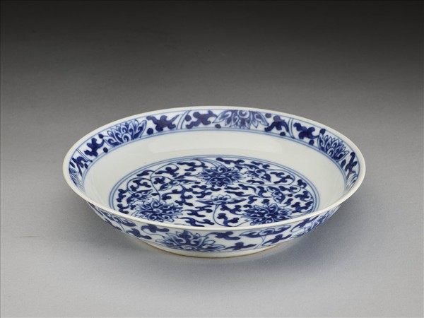侈口窄唇,淺壁,矮圈足。胎質較薄,外壁畫盛開及待開之纏枝番蓮共十二朵,盤心雙圈青線內則繪綻放之番蓮三朵與未綻番蓮七朵,內壁口沿飾番蓮紋一周。底有「大清乾隆年製」三行六字篆款。