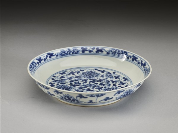 侈口窄唇,淺壁,矮圈足。胎質較薄,外壁畫盛開及待開之纏枝番蓮共十二朵,盤心雙圈青線內則繪綻放之番蓮三朵與未綻番蓮七朵,內壁口沿飾番蓮紋一周。底有「大清乾隆年製」三行六字篆款。