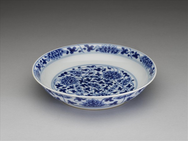 侈口窄唇,淺壁,矮圈足。胎質較薄,外壁畫盛開及待開之纏枝番蓮共十二朵,盤心雙圈青線內則繪綻放之番蓮三朵與未綻番蓮七朵,內壁口沿飾番蓮紋一周。底有「大清乾隆年製」三行六字篆款。