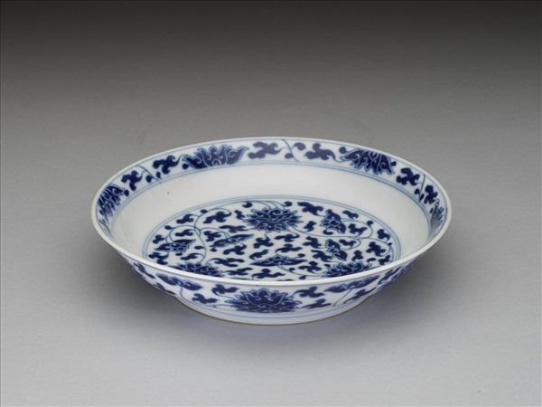 侈口窄唇,淺壁,矮圈足。胎質較薄,外壁畫盛開及待開之纏枝番蓮共十二朵,盤心雙圈青線內則繪綻放之番蓮三朵與未綻番蓮七朵,內壁口沿飾番蓮紋一周。底有「大清乾隆年製」三行六字篆款。