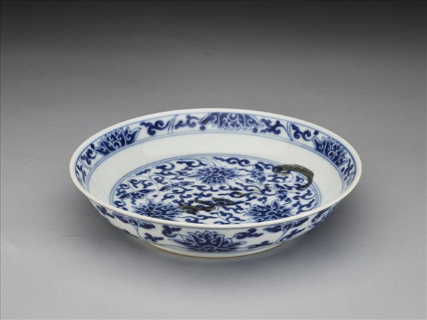 侈口窄唇,淺壁,矮圈足。胎質較薄,外壁畫盛開及待開之纏枝番蓮共十二朵,盤心雙圈青線內則繪綻放之番蓮三朵與未綻番蓮七朵,內壁口沿飾番蓮紋一周。底有「大清乾隆年製」三行六字篆款。