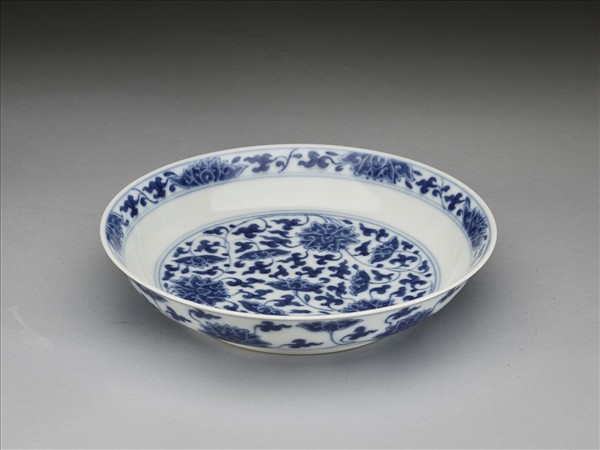 侈口窄唇,淺壁,矮圈足。胎質較薄,外壁畫盛開及待開之纏枝番蓮共十二朵,盤心雙圈青線內則繪綻放之番蓮三朵與未綻番蓮七朵,內壁口沿飾番蓮紋一周。底有「大清乾隆年製」三行六字篆款。
