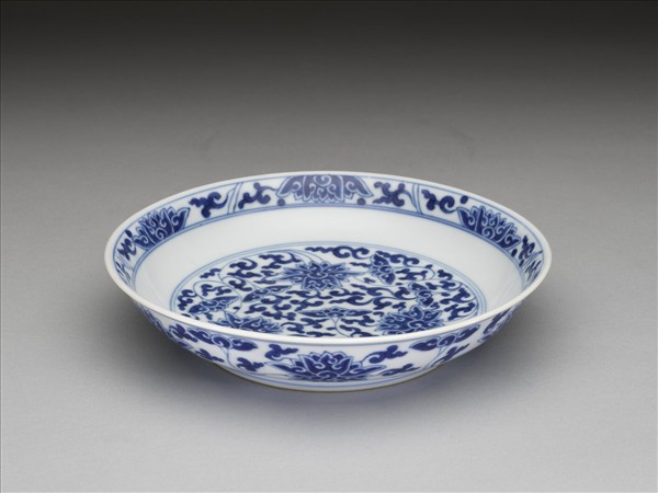 侈口窄唇,淺壁,矮圈足。胎質較薄,外壁畫盛開及待開之纏枝番蓮共十二朵,盤心雙圈青線內則繪綻放之番蓮三朵與未綻番蓮七朵,內壁口沿飾番蓮紋一周。底有「大清乾隆年製」三行六字篆款。