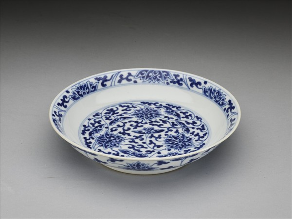 侈口窄唇,淺壁,矮圈足。胎質較薄,外壁畫盛開及待開之纏枝番蓮共十二朵,盤心雙圈青線內則繪綻放之番蓮三朵與未綻番蓮七朵,內壁口沿飾番蓮紋一周。底有「大清乾隆年製」三行六字篆款。