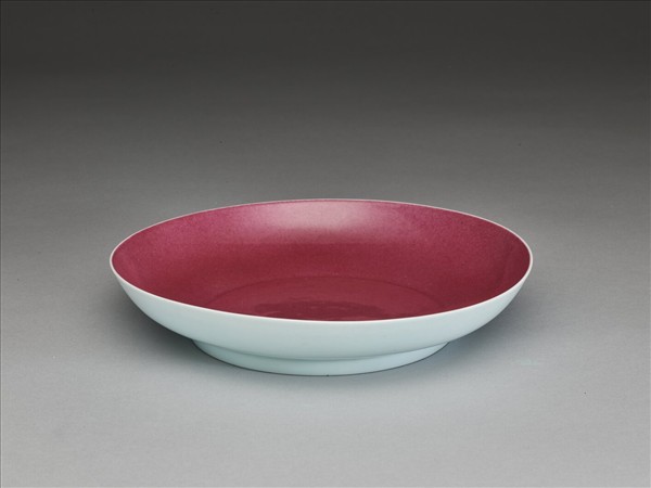 侈口,淺壁,矮圈足。外壁施天藍釉,內壁施胭脂釉,盤心飾印花龍紋。圈足底施白釉,書有青花「宣德年製」四字楷款,外加雙框。