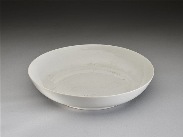 侈口,淺壁,矮圈足。胎質較厚,通體甜白釉,樸素無紋飾。圈足底書有青花「大明弘治年製」二行六字楷款,外加雙圈。