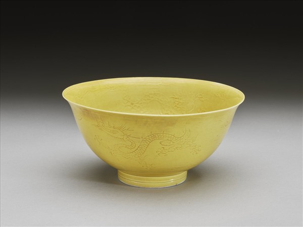 侈口窄唇,深壁,矮圈足。內外壁各錐拱雙龍紋,隙地加飾朵雲,口足間分飾淺線八道。胎質較薄,通體嬌黃色釉。底有青花書「大明成化年製」六楷字款,外加雙圈。