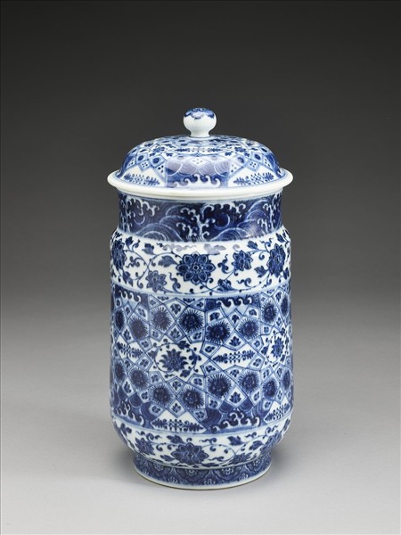 帶蓋白地青花瓷罐,圓口,直頸,折肩,肩甚窄,直腹如筒,圈足。頸部波濤紋。外壁上下各飾一帶纏枝花卉,中央部分等距裝飾數個角星,角星之中繪卷枝花,並將角星外廓直線分別延長,彼此交錯分割出各式幾何區塊,並於幾何區塊中各自填飾大小花卉、葉片、波濤紋。足牆繪飾半邊盛開花朵,其順次排列如覆蓮瓣。蓋外壁裝飾概念與外壁類同,都是以中心向外分割輻出各式幾何形區塊,並以花卉、波濤填飾其中。由其器形與紋樣看來,顯然是模仿自明代初年的青花瓷器(現藏於北京故宮,品名為〈青花錦紋壯罐〉)。學者曾進一步論及這種器形的來源,推定源頭可以追溯至伊斯蘭陶瓷。除此之外,若將其外壁主紋飾與十四世紀敘利亞馬木路克王朝時期〈玻璃金彩唾壺〉外壁紋飾相較,就會發現其裝飾概念類同,特別是〈玻璃金彩唾壺〉幾何區塊中填飾的如花似葉的小紋樣,同見於本器與北京故宮藏品。如此一來,我們就可以瞭解本器樣式、紋飾所模仿的對象與源流,實是明代初年受外國影響所製作的作品。