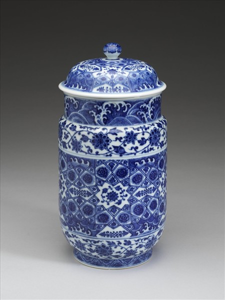 帶蓋白地青花瓷罐,圓口,直頸,折肩,肩甚窄,直腹如筒,圈足。頸部波濤紋。外壁上下各飾一帶纏枝花卉,中央部分等距裝飾數個角星,角星之中繪卷枝花,並將角星外廓直線分別延長,彼此交錯分割出各式幾何區塊,並於幾何區塊中各自填飾大小花卉、葉片、波濤紋。足牆繪飾半邊盛開花朵,其順次排列如覆蓮瓣。蓋外壁裝飾概念與外壁類同,都是以中心向外分割輻出各式幾何形區塊,並以花卉、波濤填飾其中。由其器形與紋樣看來,顯然是模仿自明代初年的青花瓷器(現藏於北京故宮,品名為〈青花錦紋壯罐〉)。學者曾進一步論及這種器形的來源,推定源頭可以追溯至伊斯蘭陶瓷。除此之外,若將其外壁主紋飾與十四世紀敘利亞馬木路克王朝時期〈玻璃金彩唾壺〉外壁紋飾相較,就會發現其裝飾概念類同,特別是〈玻璃金彩唾壺〉幾何區塊中填飾的如花似葉的小紋樣,同見於本器與北京故宮藏品。如此一來,我們就可以瞭解本器樣式、紋飾所模仿的對象與源流,實是明代初年受外國影響所製作的作品。