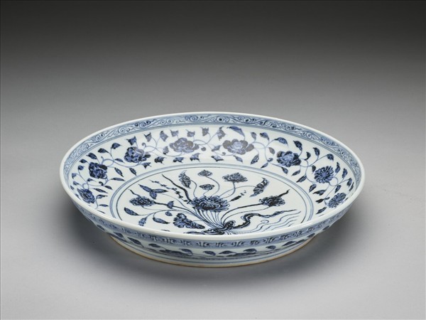 盤子弧壁,矮圈足。器底露胎,全器以青花為飾。口沿下飾卷草紋,內壁有蓮花、石榴、菊花等各式花朵共十三朵。外壁口沿下繪回紋,壁面畫纏枝花卉十四朵,近圈足處有卷草紋一周。盤心主紋飾是蓮花、慈菇等紮成的花束。因為外交往來以及貿易交換等因素,土耳其的托普卡普宮殿博物館以及伊朗的阿德卑爾神廟收藏有大量的十五世紀初期青花瓷器,類似這件作品的青花一把蓮盤,在兩大收藏中也都可以見到。