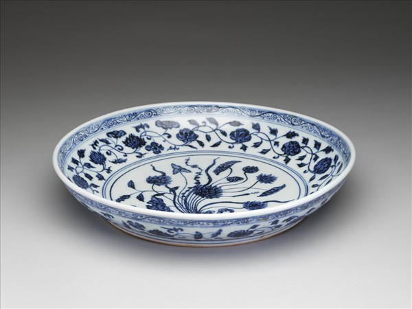 盤子弧壁,矮圈足。器底露胎,全器以青花為飾。口沿下飾卷草紋,內壁有蓮花、石榴、菊花等各式花朵共十三朵。外壁口沿下繪回紋,壁面畫纏枝花卉十四朵,近圈足處有卷草紋一周。盤心主紋飾是蓮花、慈菇等紮成的花束。因為外交往來以及貿易交換等因素,土耳其的托普卡普宮殿博物館以及伊朗的阿德卑爾神廟收藏有大量的十五世紀初期青花瓷器,類似這件作品的青花一把蓮盤,在兩大收藏中也都可以見到。