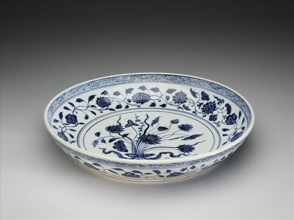 盤子弧壁,矮圈足。器底露胎,全器以青花為飾。口沿下飾卷草紋,內壁有蓮花、石榴、菊花等各式花朵共十三朵。外壁口沿下繪卷草紋,壁面畫纏枝花卉十四朵,近圈足處有回紋一周。盤心主紋飾是蓮花、慈菇等紮成的花束。因為外交往來以及貿易交換等因素,土耳其的托普卡普宮殿博物館以及伊朗的阿德卑爾神廟收藏有大量的十五世紀初期青花瓷器,類似這件作品的青花一把蓮盤,在兩大收藏中也都可以見到。