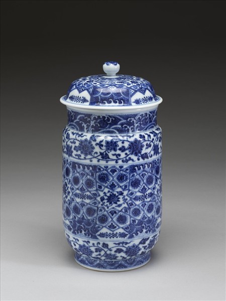 帶蓋白地青花瓷罐,圓口,直頸,折肩,肩甚窄,直腹如筒,圈足。頸部波濤紋。外壁上下各飾一帶纏枝花卉,中央部分等距裝飾數個角星,角星之中繪卷枝花,並將角星外廓直線分別延長,彼此交錯分割出各式幾何區塊,並於幾何區塊中各自填飾大小花卉、葉片、波濤紋。足牆繪飾半邊盛開花朵,其順次排列如覆蓮瓣。蓋外壁裝飾概念與外壁類同,都是以中心向外分割輻出各式幾何形區塊,並以花卉、波濤填飾其中。由其器形與紋樣看來,顯然是模仿自明代初年的青花瓷器(現藏於北京故宮,品名為〈青花錦紋壯罐〉)。學者曾進一步論及這種器形的來源,推定源頭可以追溯至伊斯蘭陶瓷。除此之外,若將其外壁主紋飾與十四世紀敘利亞馬木路克王朝時期〈玻璃金彩唾壺〉外壁紋飾相較,就會發現其裝飾概念類同,特別是〈玻璃金彩唾壺〉幾何區塊中填飾的如花似葉的小紋樣,同見於本器與北京故宮藏品。如此一來,我們就可以瞭解本器樣式、紋飾所模仿的對象與源流,實是明代初年受外國影響所製作的作品。