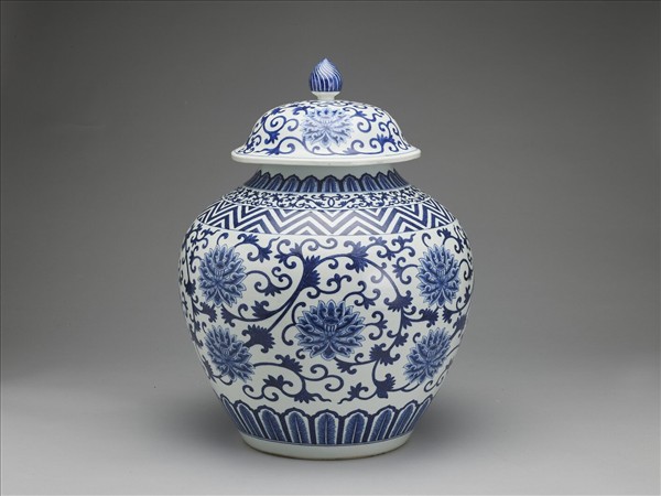 短頸,豐肩,碩腹下斂,臥足,帶寶珠鈕笠形蓋。通體施白釉,裝飾青花紋樣。蓋與腹外壁滿飾纏枝番蓮紋,頸部與肩部則分飾蕉葉紋、纏枝花卉紋、三角形紋一周,腹外壁近底處亦飾蕉葉紋一周。底有青花書「大清光緒年製」二行六字楷款。
