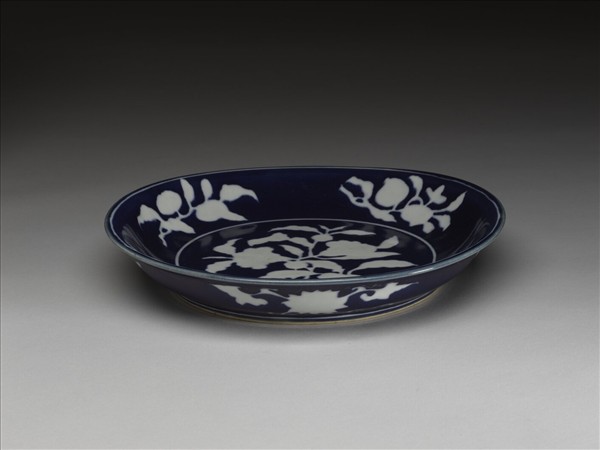 侈口窄唇,淺壁,矮圈足。內壁飾石榴、枇杷等果實四枝,盤心飾玉蘭花一枝。外壁飾番蓮花四枝。霽青釉地,勾勒花紋,面施白釉,內外加飾白線三道。盤底未施釉,全部露胎。