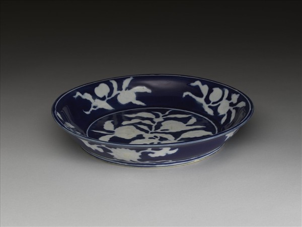 侈口窄唇,淺壁,矮圈足。內壁飾石榴、枇杷等果實四枝,盤心飾玉蘭花一枝。外壁飾番蓮花四枝。霽青釉地,勾勒花紋,面施白釉,內外加飾白線三道。盤底未施釉,全部露胎。