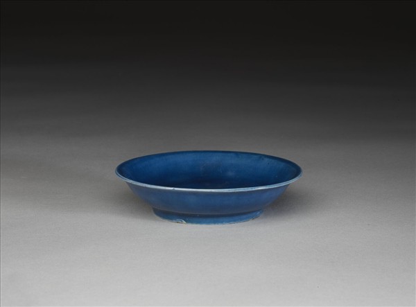 侈口窄唇,淺壁,矮圈足。薄胎骨,深青釉,樸素無紋飾。底有「大明嘉靖年製」六楷字款。