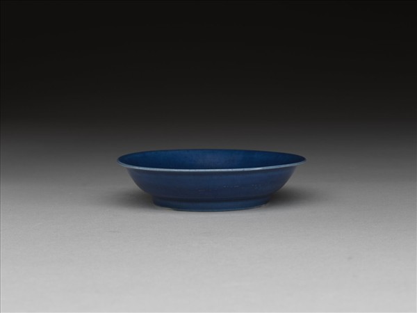 侈口窄唇,淺壁,矮圈足。薄胎骨,深青釉,樸素無紋飾。底有「大明嘉靖年製」六楷字款。