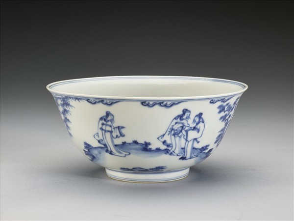侈口窄唇,深壁,矮圈足。薄胎白釉。外壁以青花畫學士偕遊於庭園樓閣,碗心畫松竹梅三友圖,內壁純白無紋飾,口、足內外分飾青線十道。