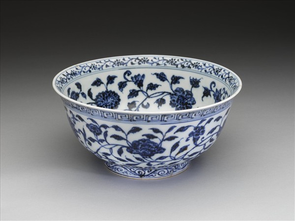 侈口窄唇,深壁,矮圈足。薄胎白釉,口唇上畫轉枝小菊花一周,內外壁各畫纏枝牡丹、菊花等四季花卉五朵,碗心畫蓮花一枝,外面口緣下畫回紋一周,底邊畫蓮瓣紋,足圈畫勾雲紋。內外花紋間加飾青線十一道。
