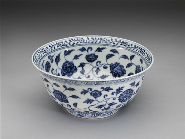 侈口窄唇,深壁,矮圈足。薄胎白釉,口唇上畫轉枝小菊花一周,內外壁各畫纏枝牡丹、菊花等四季花卉五朵,碗心畫蓮花一枝,外面口緣下畫回紋一周,底邊畫蓮瓣紋,足圈畫勾雲紋。內外花紋間加飾青線十一道。