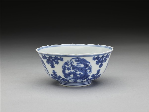 蓮瓣形花邊口、微侈,深弧壁,矮圈足。外壁青花繪三團雲龍紋,團龍之間各飾花葉紋,底邊畫如意紋,內壁白釉無紋,內底飾雲龍紋。青花濃重,係採回青釉料,胎骨均勻,製作細緻,但偶見縮釉棕眼。底書「大明嘉靖年製」六字二行楷款,外加雙圈。《江西大志》卷七「陶書」節上記載,嘉靖二十五年燒製有「青花白瓷裏青雲龍外團龍菱花茶鍾三千」,此器紋飾、形制與其相符,而且尺寸亦與茶鍾相近,清室繕後委員會清點帳上亦登錄為「嘉靖款青團龍葵瓣茶盅」,可見此器自明代以迄清代一直都是宮廷的飲茶用器。
