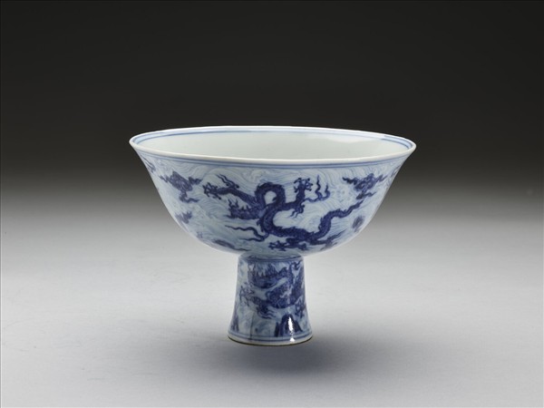 侈口窄唇,深壁,高圈足。外面畫青龍五條,隙地滿畫淺青波濤紋及深青山石。口足間加飾青線八道。內面純白,樸素無紋飾。碗心有青花書「大明宣德年製」六楷字款,外加雙圈。