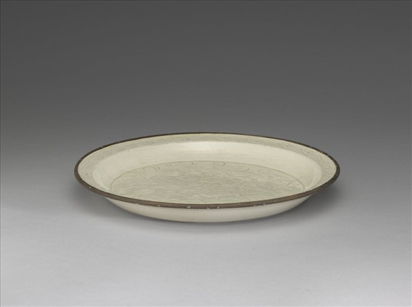 侈口出唇外折,口緣露胎,帶銅釦,淺壁平底,臥足。折沿上勾劃卷雲紋一週,盤內底滿劃轉枝牡丹花紋及卷草紋,釉色微黃。定窯窯址位在河北省曲陽縣澗磁村、燕山村一帶,窯場廣佈,是宋金時期北方最著名的白瓷窯場。