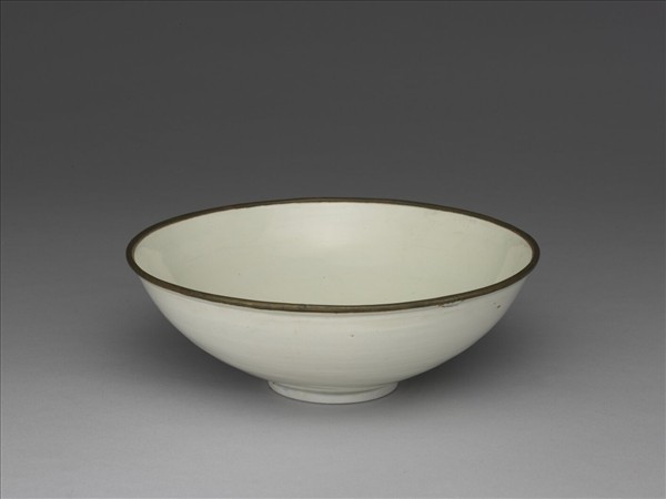 侈口,口沿加鑲銅釦,深壁上豐下斂,圓底矮圈足。薄胎施罩青白色釉,釉色汎青,內外壁光素無紋,器身外壁微見輪製時留下的「刷絲」遺痕和釉汁流淌的「淚痕」,圈足有微傷缺。