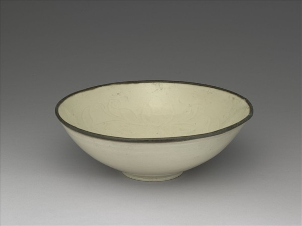 侈口深壁,帶銅釦,從外壁口沿銅釦未附著處可見口沿一圈露胎,圓底矮圈足。器內壁劃轉枝蓮花紋三朵,內底心劃蓮花一朵,外壁光素無紋飾,略見輪製痕跡。施罩牙白色釉,釉色勻潤。定窯窯址位在河北省曲陽縣澗磁村、燕山村一帶,窯場廣佈,是宋金時期北方最著名的白瓷窯場。