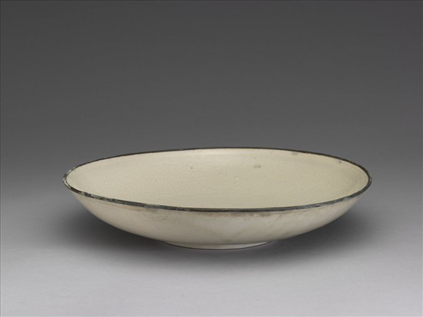 侈口淺壁,帶銅釦,平底矮圈足。盤內口沿下印弦紋二道,器內壁印轉枝花卉紋一周,盤內底印回紋一周,中印花卉紋。胎骨較厚,略施薄牙白釉。定窯窯址位在河北省曲陽縣澗磁村、燕山村一帶,窯場廣佈,是金元時期北方最著名盛燒的白瓷窯場。