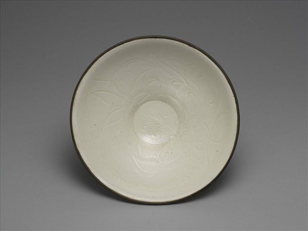 侈口、深壁、圓底,矮圈足,口沿鑲銅釦。全器施白色釉,外底足內亦施釉,圈足底緣無釉露胎。外壁光素無紋,內壁以劃花技法滿飾蓮花紋,花瓣細長優雅,葉片捲曲有致,整體風格端莊清麗。外壁器面可清楚見到轆轤鏇削留下的痕跡,並有多道釉汁流淌的痕跡,稱之為「淚痕」。定窯作品中的紋飾圖樣十分豐富,而劃花蓮花紋則為常出現的植物花卉式樣。口沿鑲銅釦亦為定窯重要特色之一,除了可遮掩覆燒時產生的芒口外,亦結合了當時人們對於金銀器飾的喜愛。