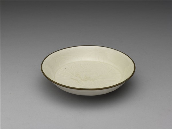 敞口,淺壁,折腰,矮圈足,口沿鑲銅釦。全器施米白色釉,外底足內局部缺釉,足底緣無釉露胎。外壁光素無紋,器內由碗心至周壁劃蓮花紋,線條流暢,展現陶工嫻熟工藝。口沿鑲銅釦為定窯重要特色之一,除了可遮掩覆燒時產生的芒口外,亦結合了當時人們對於金銀器飾的喜愛。