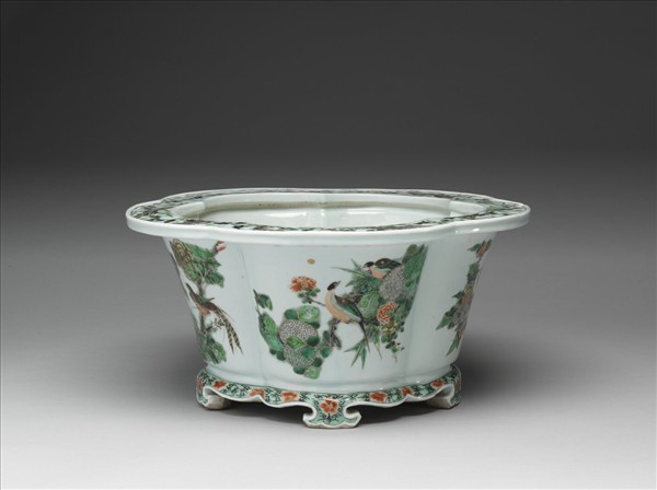 花盆作五瓣梅花型,平折沿口,沿邊凸起一道棱邊,深壁,雲頭形足。底挖一圓形排水孔。口沿之下以青花橫書一行「大清康熙年製」六字楷款。胎骨厚實堅致,通體罩施白釉,釉色清亮透明。白釉之上再以各色低溫釉彩彩繪具象與簡化的圖案。折沿器面裝飾以四季花卉,盆外周壁畫寫生花鳥,足邊點綴細密的朵花圖案。疏密變化的圖案,讓十七世紀的皇家御用花盆顯得氣派非凡。晚明流行的五彩瓷繪至清康熙時期猶有繼續加以發展的現象。如表現五彩的顏料,在康熙官窯作品上,黑色彩料的使用得更為頻繁,同時釉上藍彩的出現,亦能突破以往只能以釉下青花作為五彩紋飾的局限。釉上藍彩燒成的色調,其濃豔程度甚致能夠超過青花,與紅、黃、綠、紫、黑、金等其他彩料,一起將康熙五彩裝扮得明亮耀眼。此品筆觸酣暢、畫意生動,具有典型的時代特色。