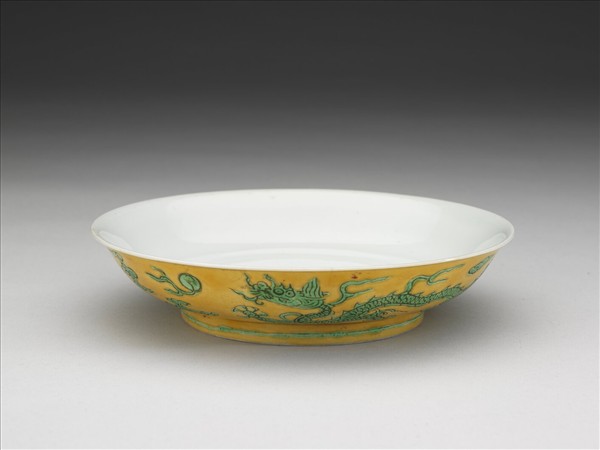 嬌黃釉綠彩雙龍紋盤