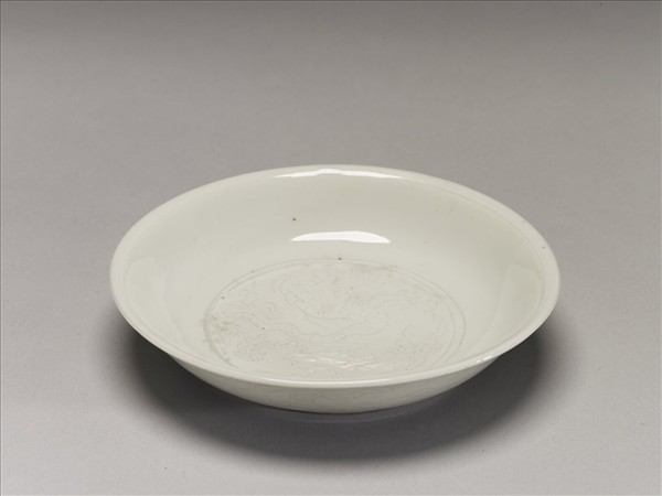 侈口窄唇,淺壁,矮圈足。胎骨稍厚,盤心及外壁淺劃雲龍紋三條,通體滿施甜白釉。底劃有「大明嘉靖年製」六楷字款,外加雙圈。